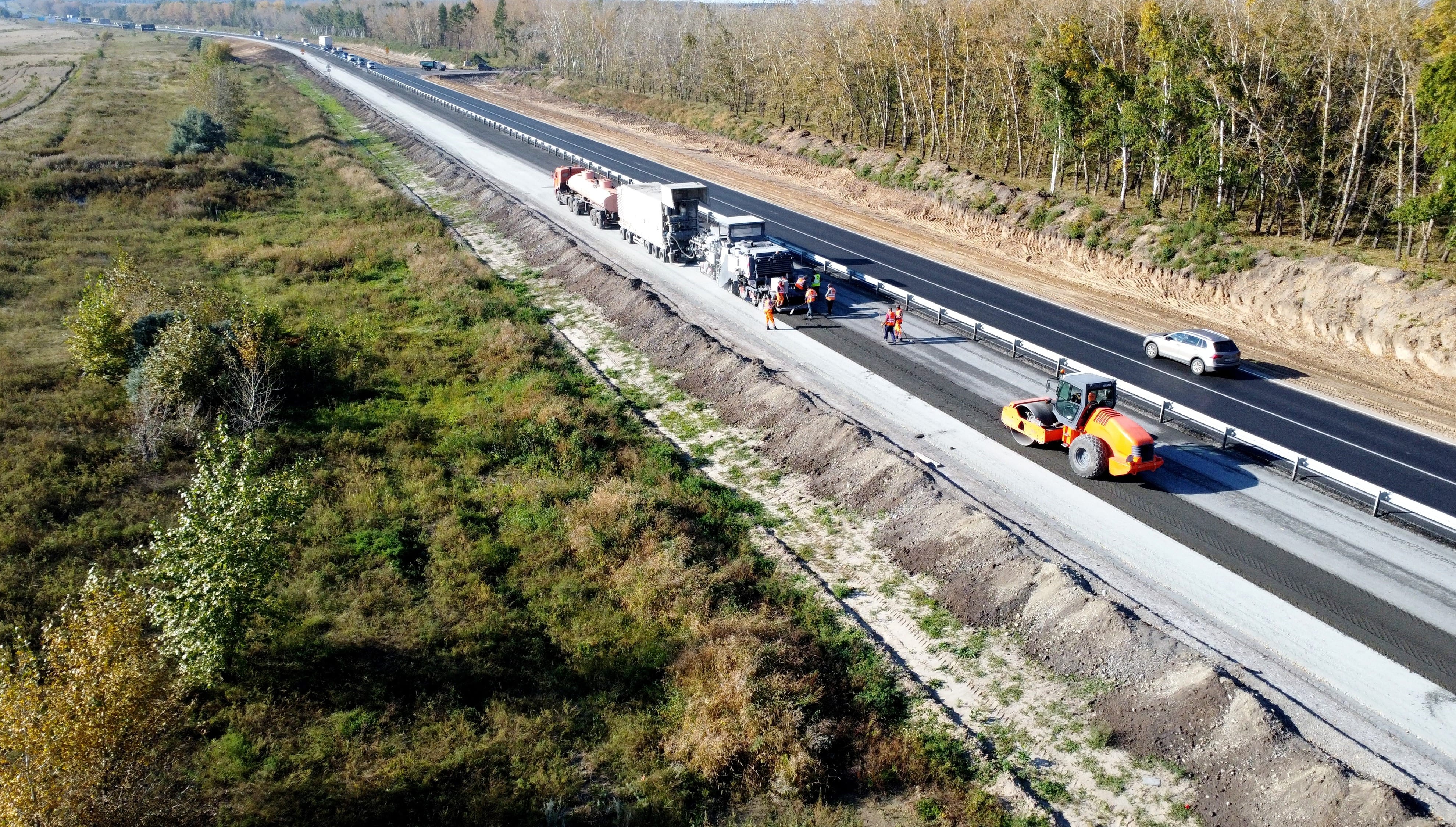 Дорожники уже завершили подготовительный этап и приступили устройству основного хода дороги. Также на отдельных участках ведется укладка асфальтобетонных слоев дорожной одежды будущей четырехполосной дороги.